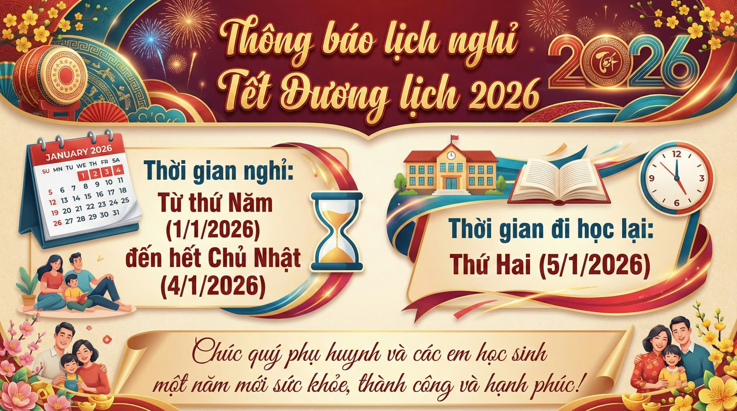 Trường TH&THCS Đinh Núp thông báo: Lịch nghỉ tết dương lịch năm 2026 cụ thể như sau: CB, GV, NV và Học sinh toàn trường được nghỉ 4 ngày bắt đầu từ ngày 1/1/2026 đến hết ngày 4/1/2026 (từ ngày thứ 5 đến hết ngày chủ nhật) . Chúc quý thầy cô và các em học sinh nghỉ tết nghỉ tết lành mạnh, vui tươi và an toàn. Trân trọng